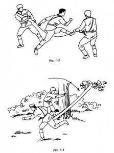 Упражнения в «мазках»—это действия, близкие по своему характеру к боксу, это «бой» двух бойцов с задачей нанести «противнику» «мазок» по лицу концами пальцев правой или левой руки (рис. 1-7) и не получить такого же «мазка» от «противника». Бойцы защищаются, подставляя руку, отбивом руки, отклонением туловища.